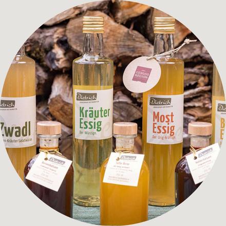 Reiner Gärungsessig, fertige Salatwürze oder feinster Birnenbalsam: Hochgenuss in jeder Küche. Und dazu Mostvarianten aus dem Naturkeller, ein frischer Mostler oder Saft direkt von der Presse.